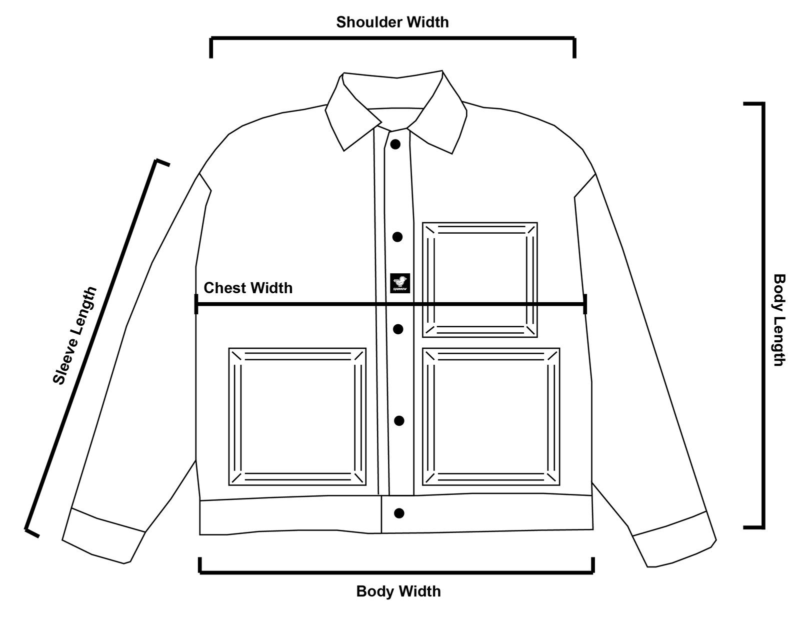 The meassurements for our first (01) jacket are approximately as follows. If you're struggling to figure out your size, try messuring against one of your current favourite jackets.